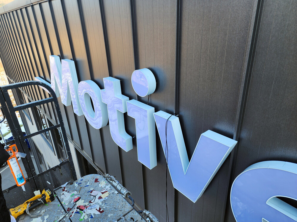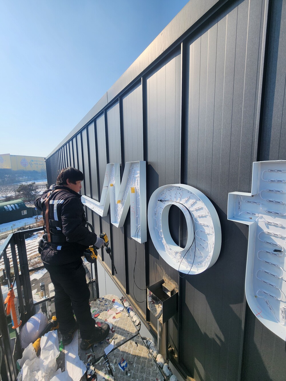 영어로 된 간판이 한글보다 좀더 시공이 편합니다. 한글은 자음과 모음이 있어서 선정리가 좀더 시간이 걸립니다. 2세트작업 하루에 다 끝나서 시공비와 크레인비도 절약됩니다.