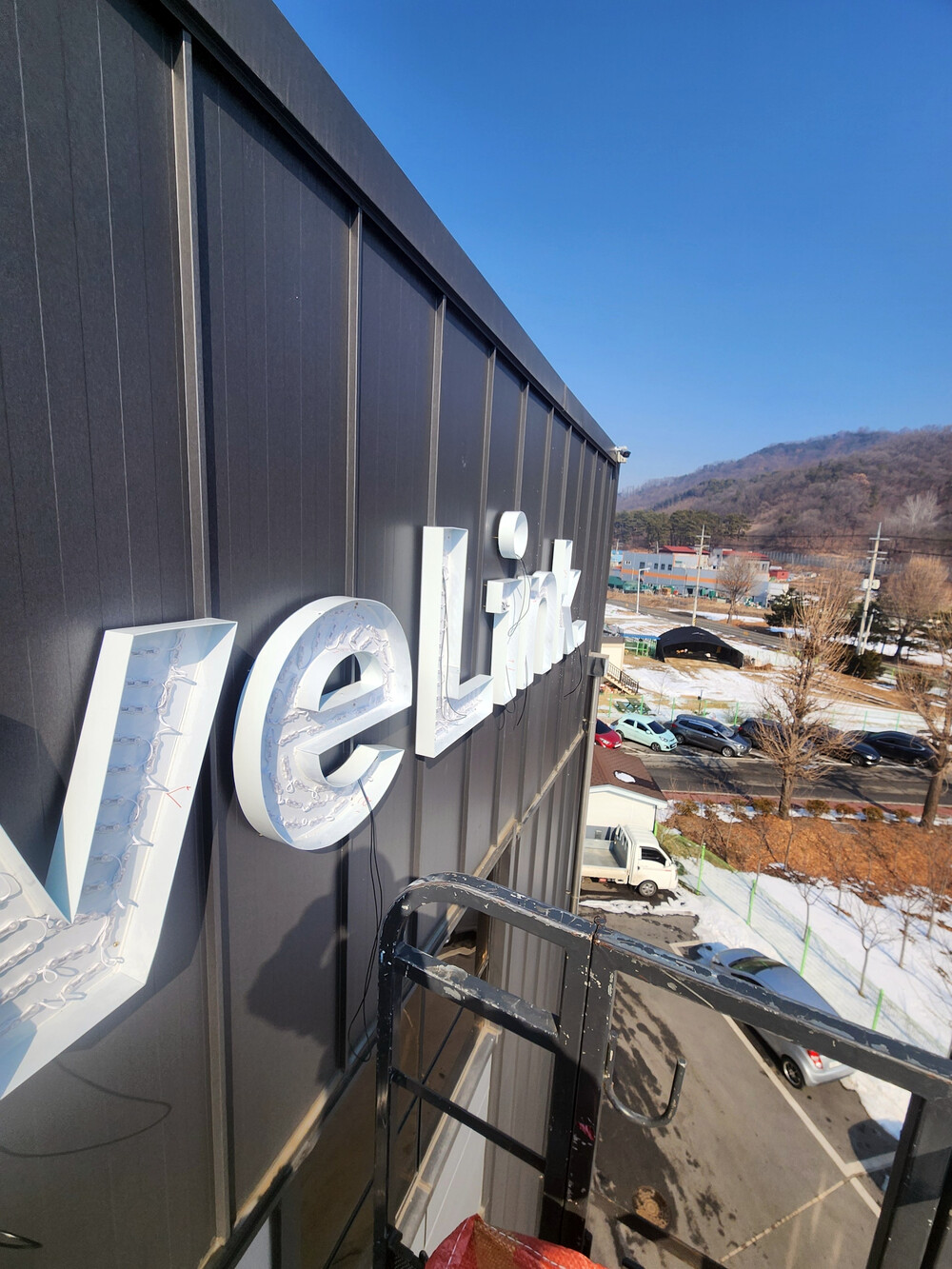 바닥이 징크판넬이라서 피스를 긴거를 써서 글자에 수평을 맞춰가면서 피스를 박아주고 전기선을 안보이게 작업을 하기 위해 노력했습니다.