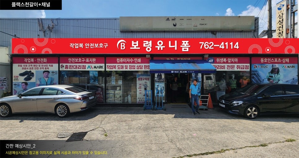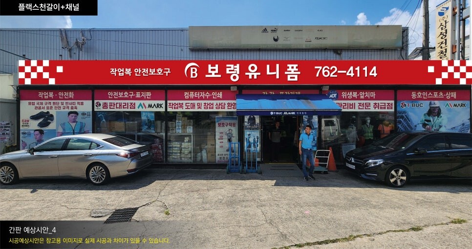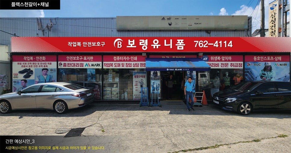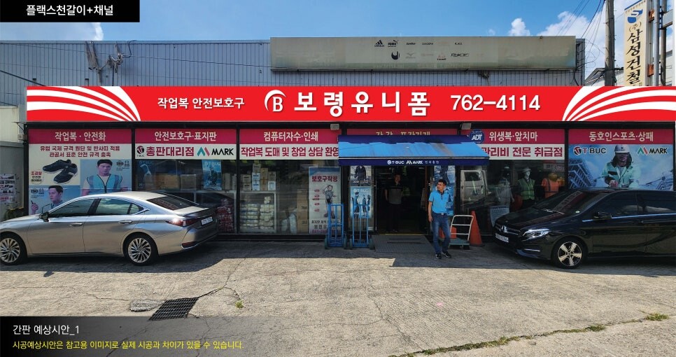 유니폼회사간판 재사용해서 다시 만드는 작업입니다. 현장사진에 디자인시안을 합성해서 보여드렸습니다.
