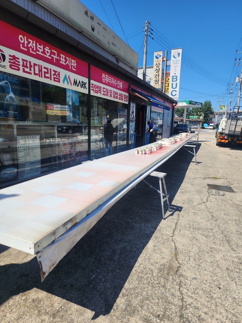 플랙스간판도 길이가 이정도 되면 3명이서 들기도 힘들고 텐션도 잘하는 숙련자가 아니면 작업시간도 오래 걸려서 경력이 안되시는 업자분들은 손도 못대는 간판입니다.