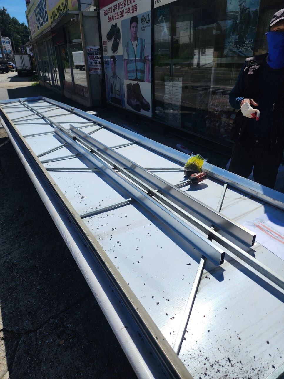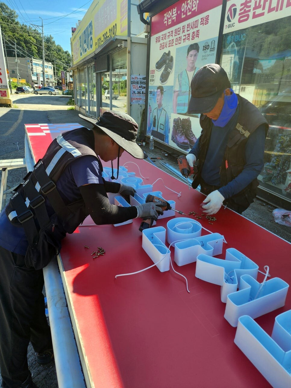분해한 플랙스간판에 보강파이프를 조립하고 천갈이를 한다음 그 위에 led채널글자를 조립합니다.