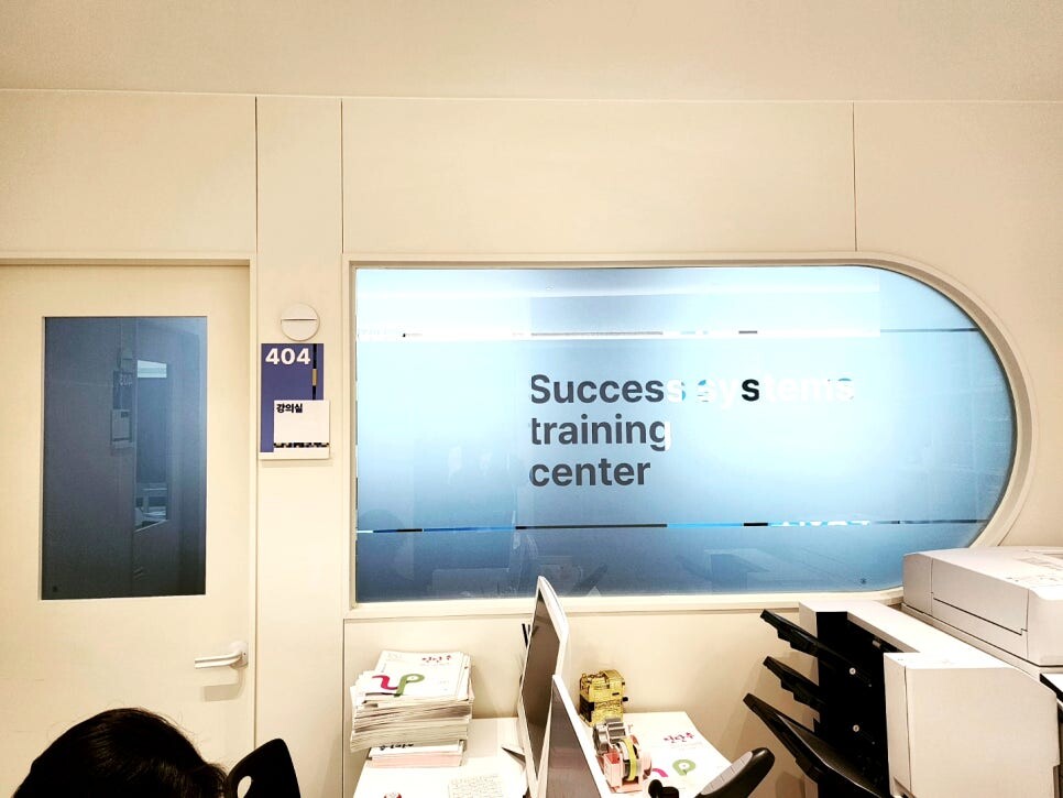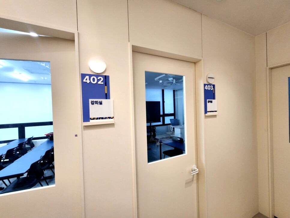 출입구 들어가서 또 문이 나와요 여기도 출입문 옆에 액자 시공해 드렸습니다. 위에는 아크릴 스카시로 문구 넣어드렸습니다.