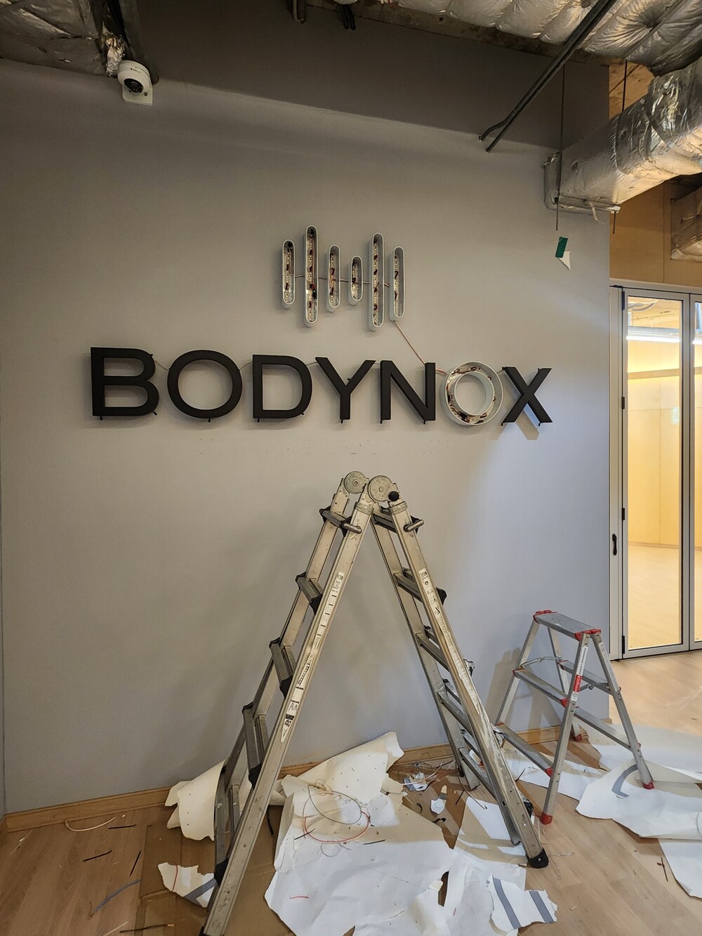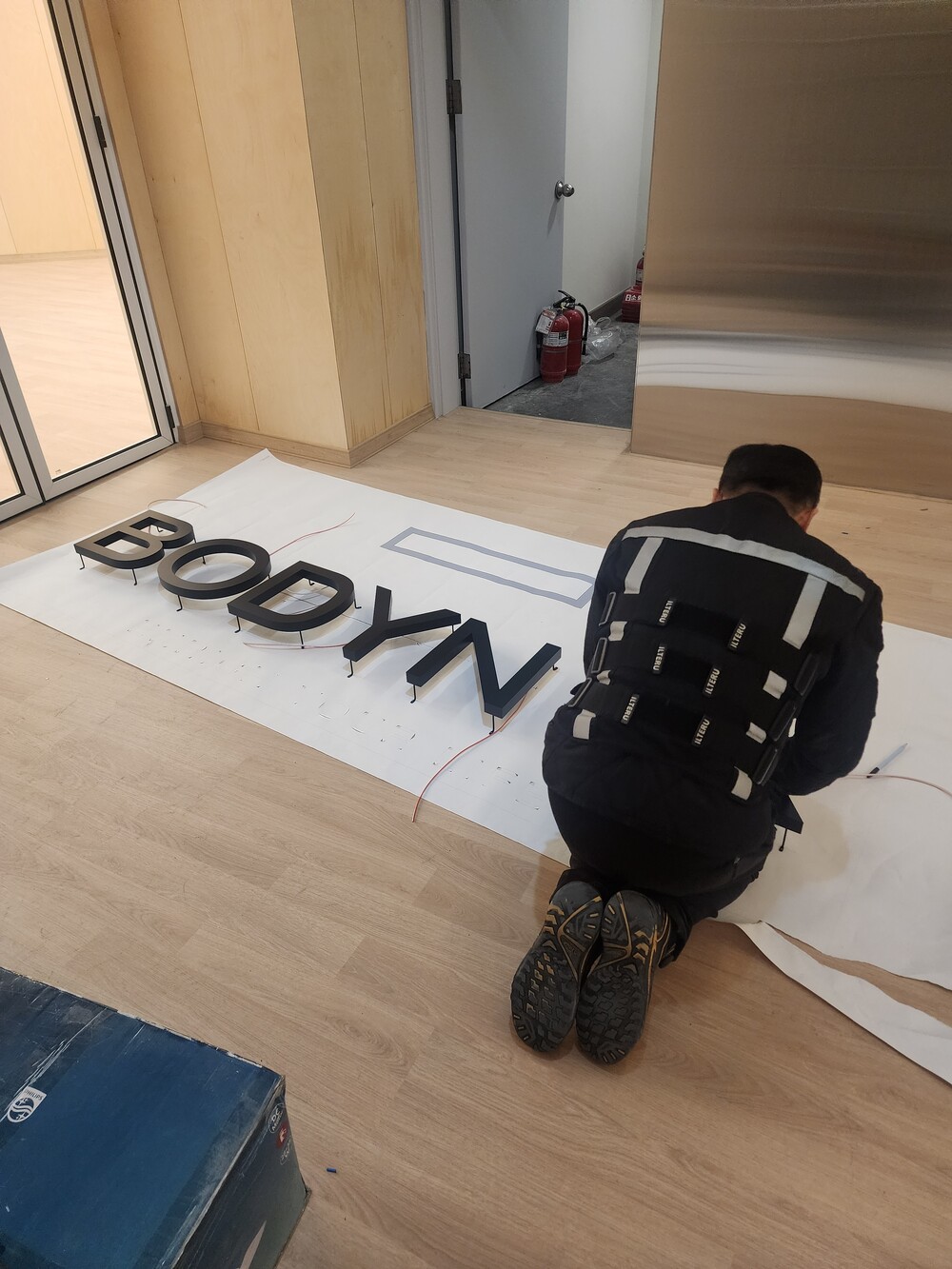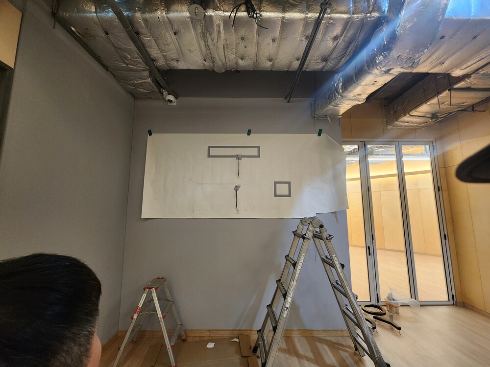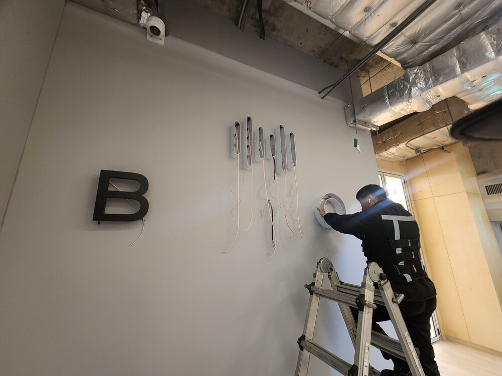 전기선을 벽 뒤로 숨기기가 쉽지 않아서 글자옆으로 점프점프해서 넘기는 방식으로 시공하기로 했습니다.