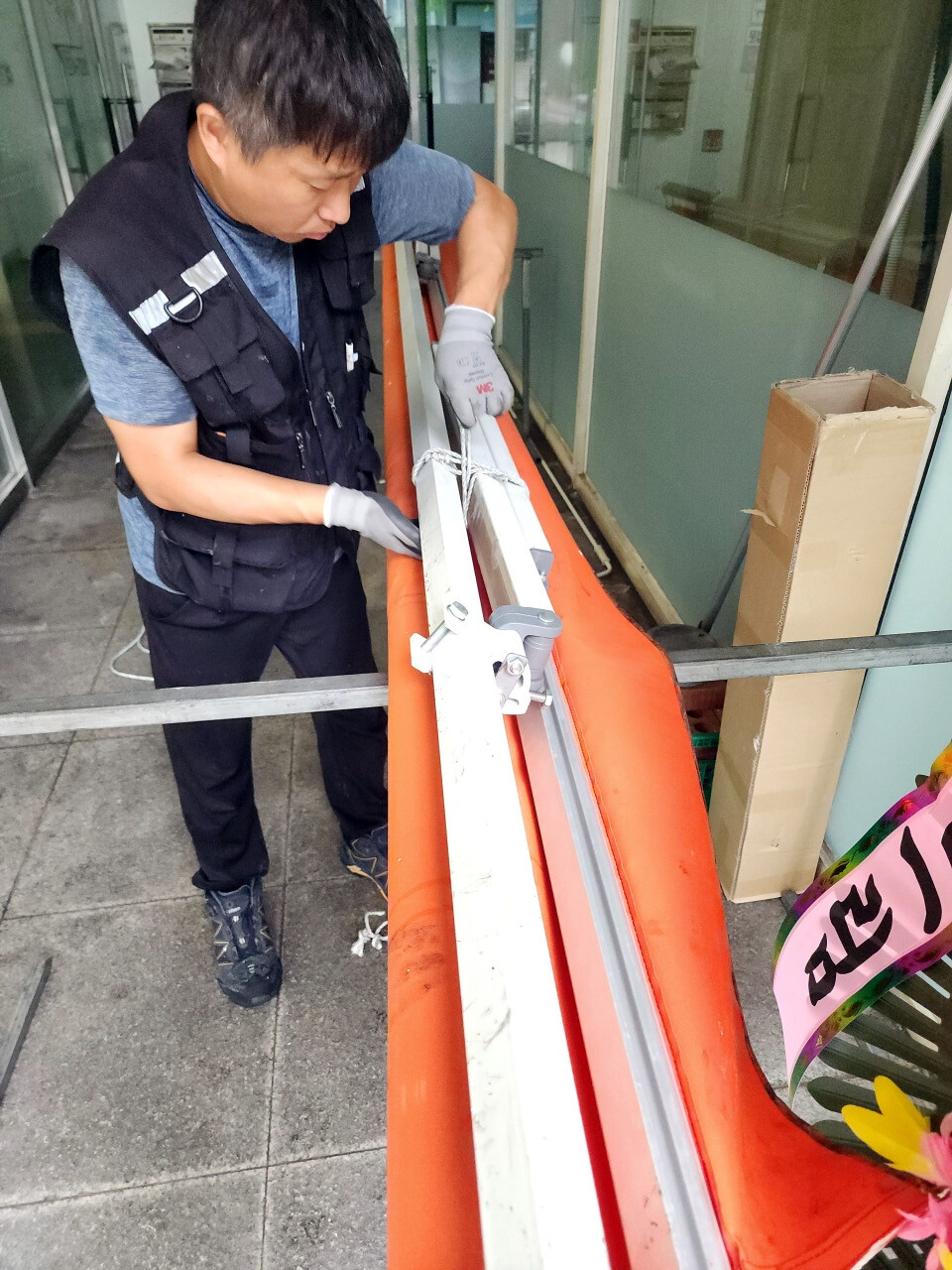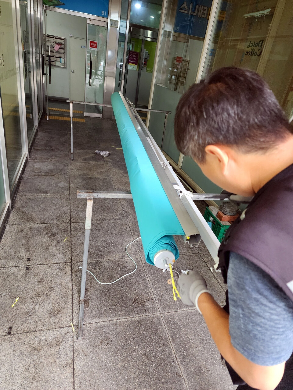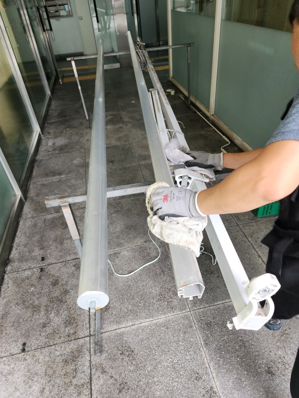기존 어닝을 잘라서 빼내고 어닝프레임을 한번 닦아줍니다. 안 닦아주면 새로 뽑은 어닝천이 지져분해 집니다.
