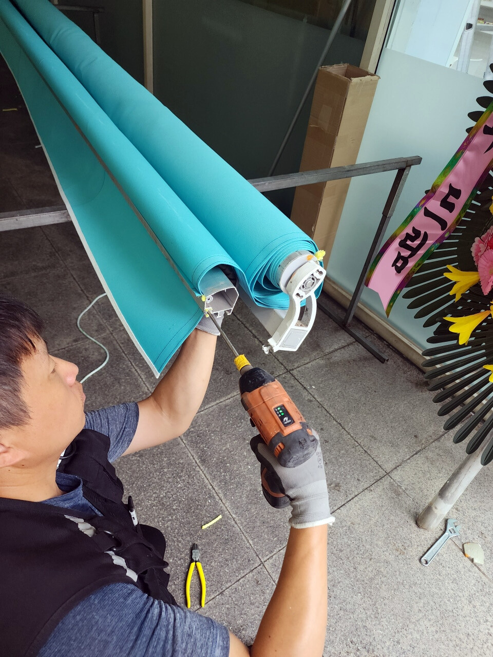 어닝천갈이를 할때 접이식 팔부분을 미리 끈으로 고정하고 어닝천갈이를 합니다. 안 묶어두면 튕겨 나갑니다.
