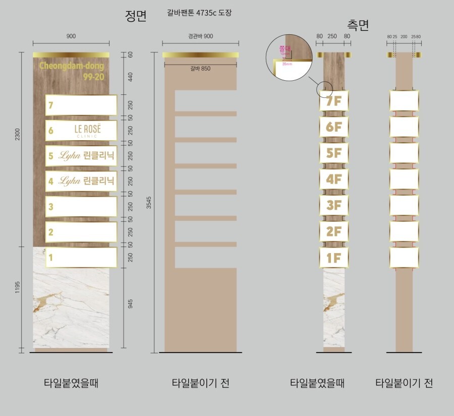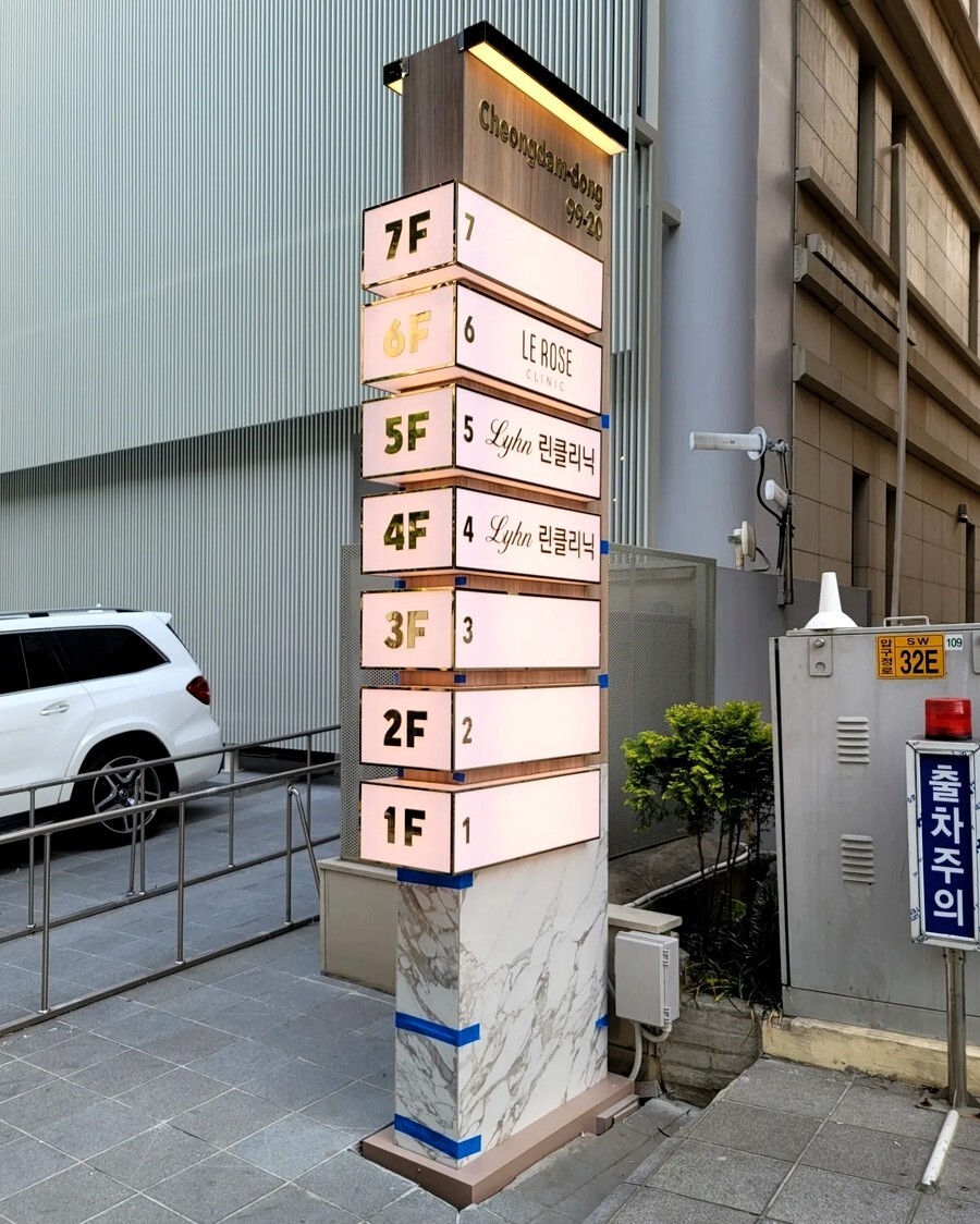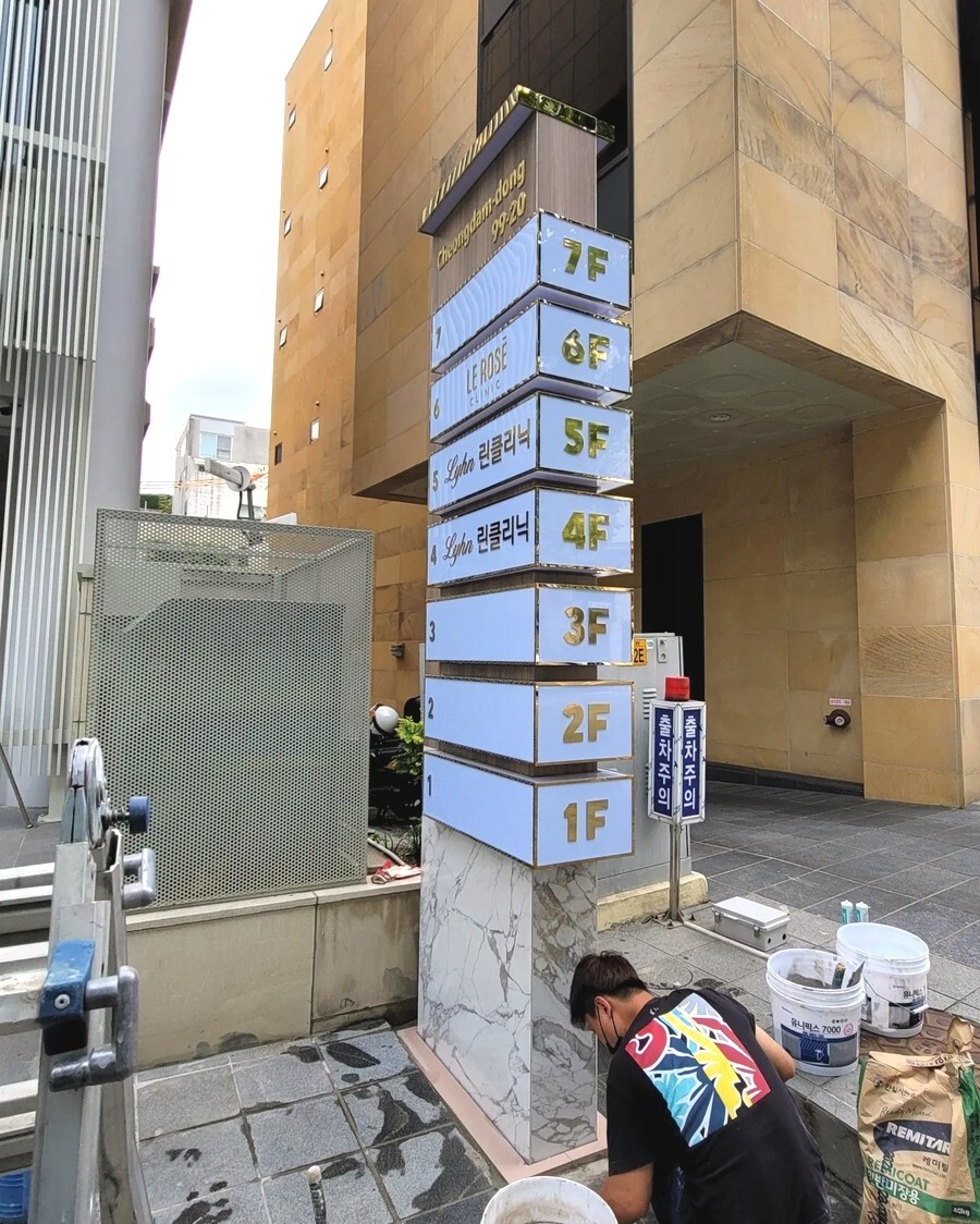 서울 청담동에서 의뢰가 들어온 특별한 지주간판입니다. 보통 간판외부에 타일이나 대리석으로 마감하는 방법은 거의 없는데 대리석이나 타일마감을 원하셔서 타일마감으로 간판을 만들어 드렸습니다.