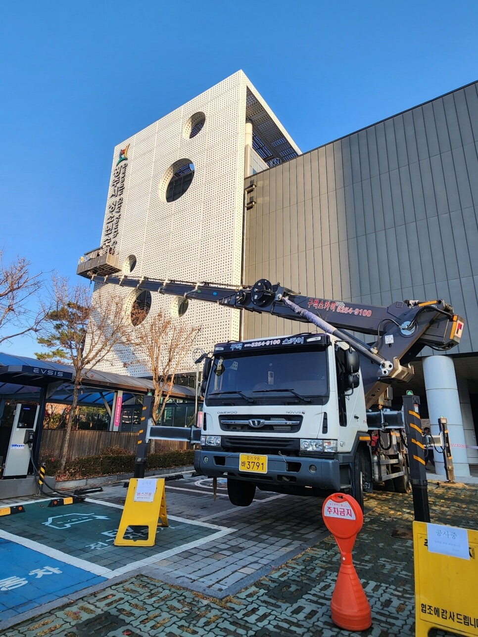 설치높이는 7층 정도 되고 장비차 위치와 간판위치에 거리가 있어서 5톤 크레인을 불러서 작업했습니다.