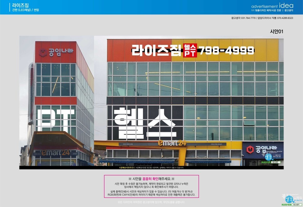 경기도 광주 삼리에서 의뢰주신 헬스장간판입니다. 현장사진에 시안을 합서해서 설치예상 시안 보여드렸습니다. |