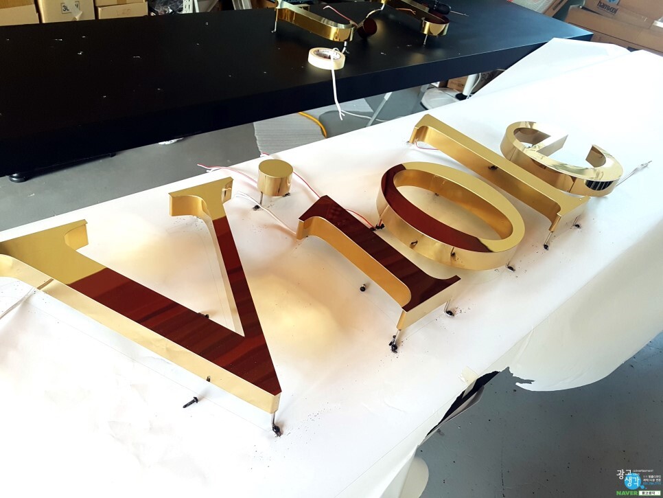 첫번째로 갈바에 종이도안을 깔고 티타늄글자를 조립합니다.