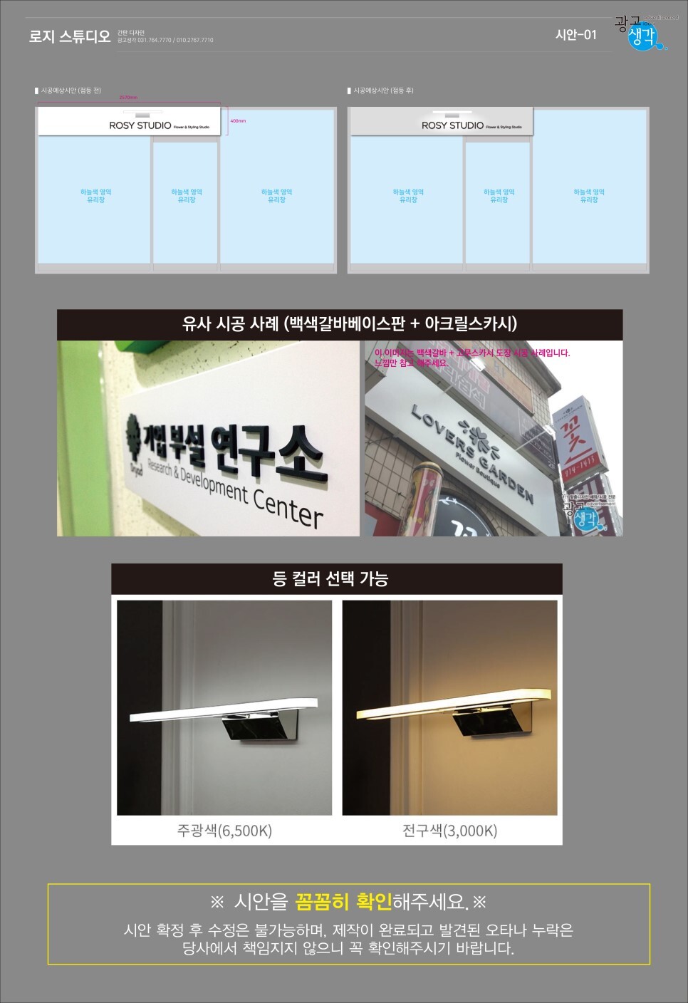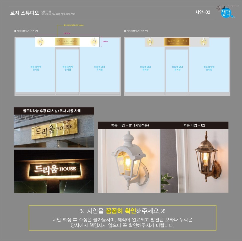 시안은 갈바베이스판에 아크릴스카시를 붙이고 포인트실내전등을 비치는 타입과 갈바베이스판에 티타늄소재에 골드타입 두가지를 제시해 드렸습니다.