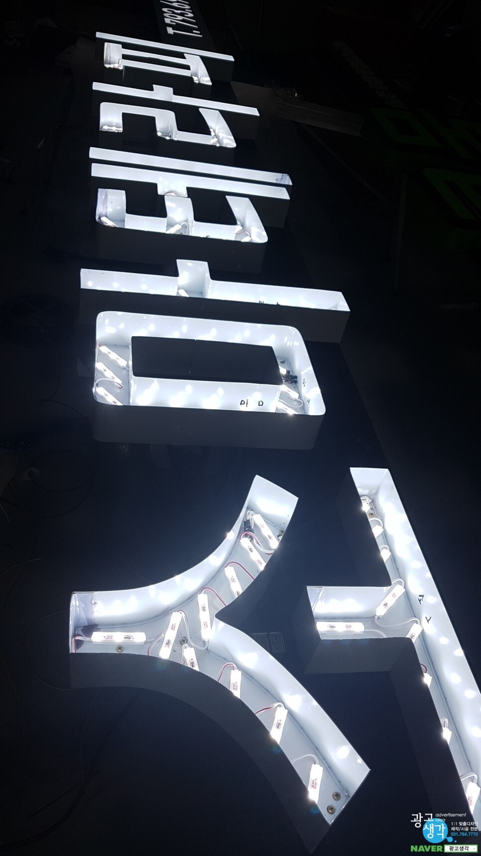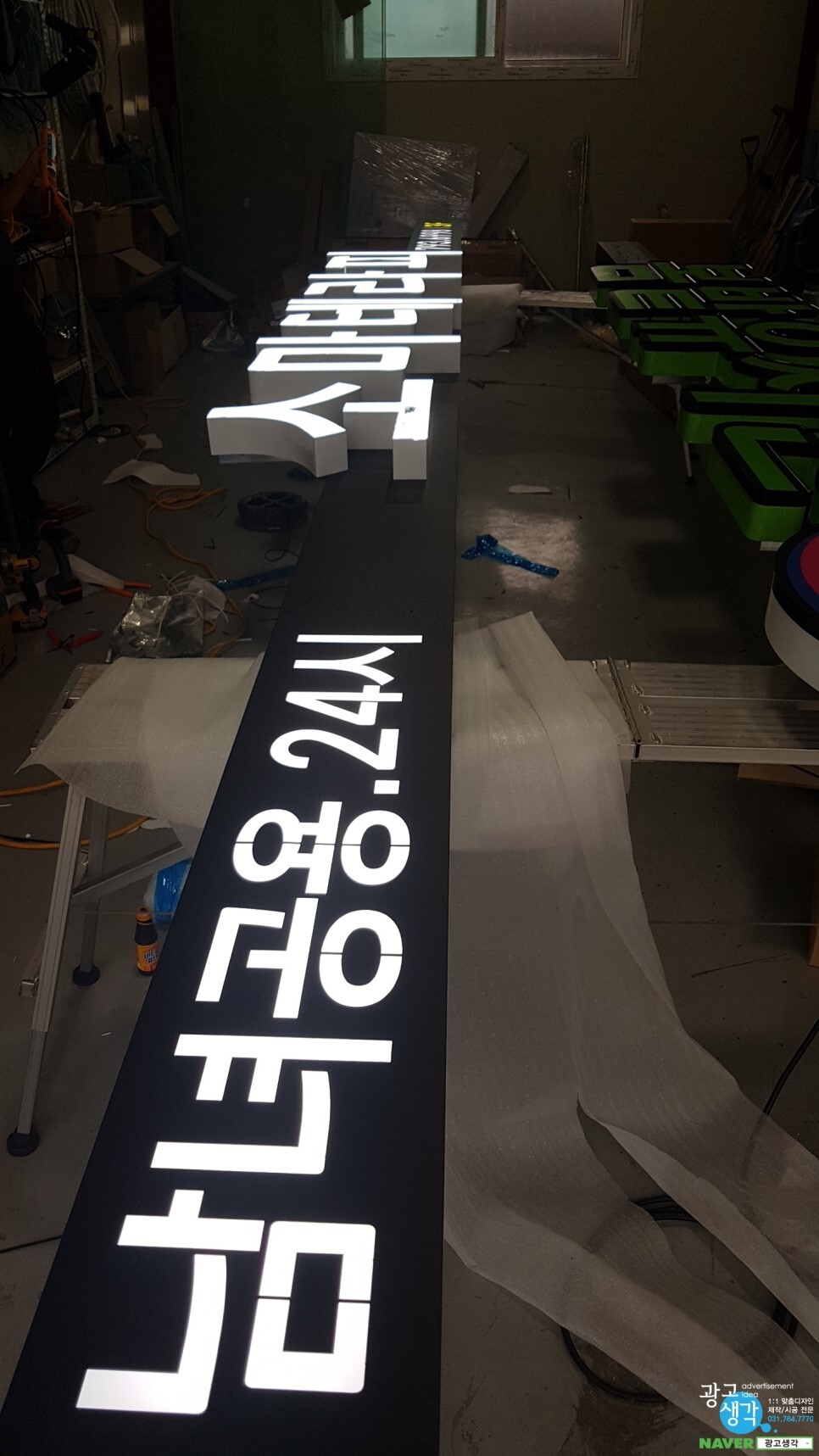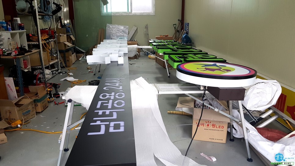 사무실에서 간판조립을 하고 테스트를 해 봅니다. 갈바로 채널바를 만들어서 글씨를 레이져로 깎고 안에 led를 넣었습니다.