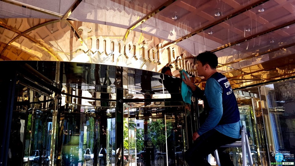 서울 논현동 임패리얼팰리스호텔에서 주문이 들어온 간판교체작업입니다. 기존에 오래된 신주간판을 떼어내고 새걸로 교체하셨습니다. 바닥이 골드스텐으로 되어 있어서 떼어내는데 조심스러웠습니다. 설치가 끝나고 꼼꼼하게 닦아드렸습니다.